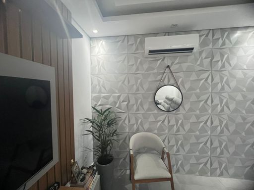 Sala ampla com ar-condicionado, sanca em gesso e iluminação em LED
