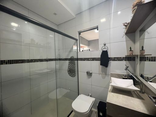 Banheiro social com gabinete planejado e box em vidro temperado (Blindex)