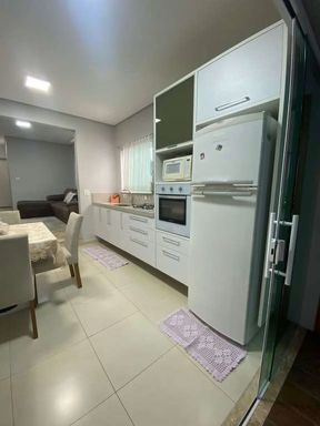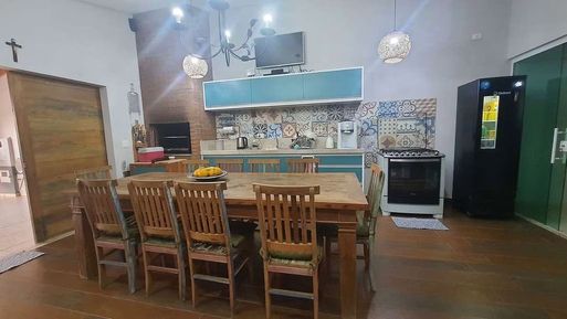 A área social é composta por salas integradas de estar e jantar, uma cozinha moderna com armários planejados, e uma área gourmet com churrasqueira, pia, planejados e até TV, perfeita para momentos de lazer com a família e amigos. A lavanderia é coberta e também conta com armários. O imóvel possui garagem para dois carros com portão automático basculante, além de um corredor lateral que garante maior privacidade.