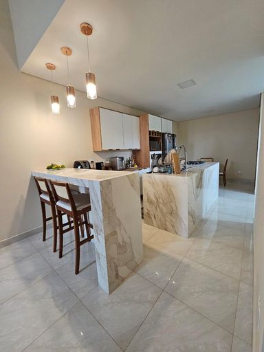 Cozinha planejada e integrada, com ilha central em porcelanato moderno – ideal para receber!