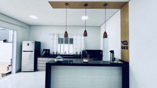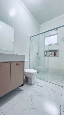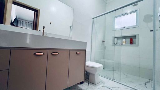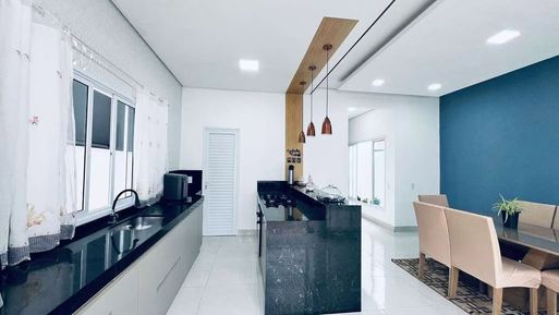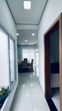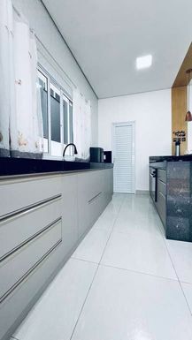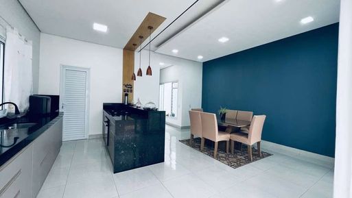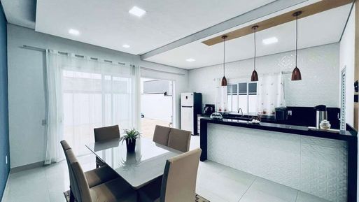 Ao entrar, os ambientes integrados trazem sensação de amplitude, com a sala de estar e jantar conectadas à cozinha. A cozinha é moderna, com armários planejados de alta qualidade, bancadas em granito e uma excelente área de circulação. O piso em porcelanato em todo o térreo realça o design sofisticado. A sala de jantar é iluminada, com espaço ideal para reunir a família.