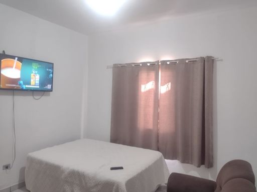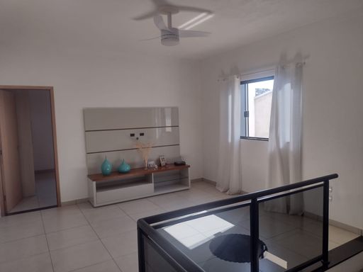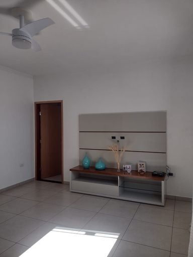 ✅ Sala de estar ampla, com painel de TV e ventilador de teto