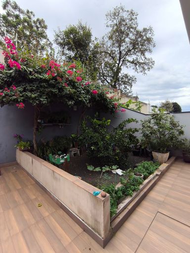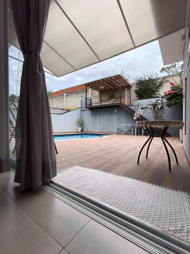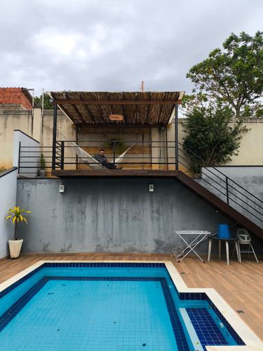 Piscina ampla com deck, jardim e árvores frutíferas (limão, acerola, pitanga e jabuticaba)