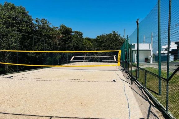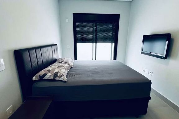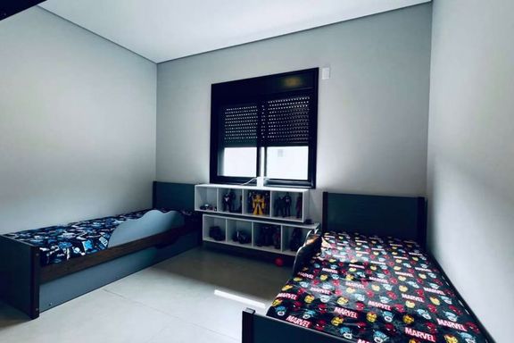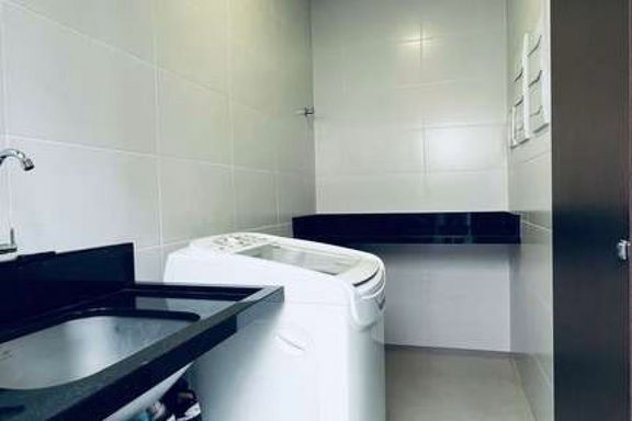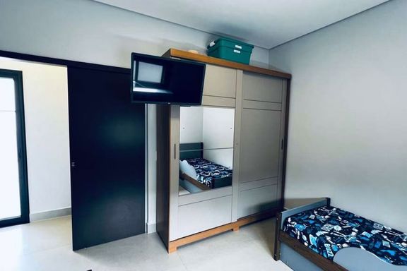 A espaçosa sala de estar com porta ripada de alumínio, combinada com a cozinha americana, forma um ambiente integrado e moderno. Para maior conforto, há preparação para boiler e ar-condicionado, além de telas mosquiteiras instaladas nos banheiros, quartos e corredor.
