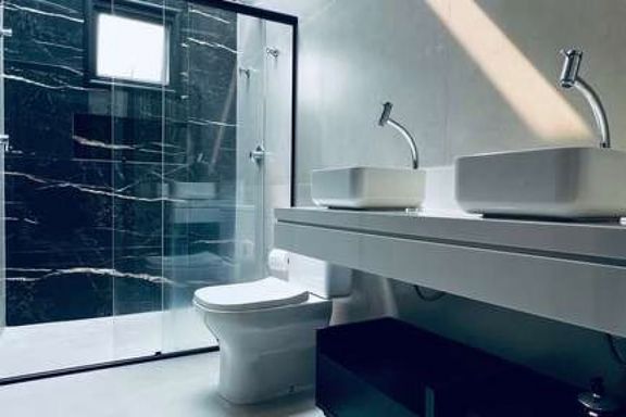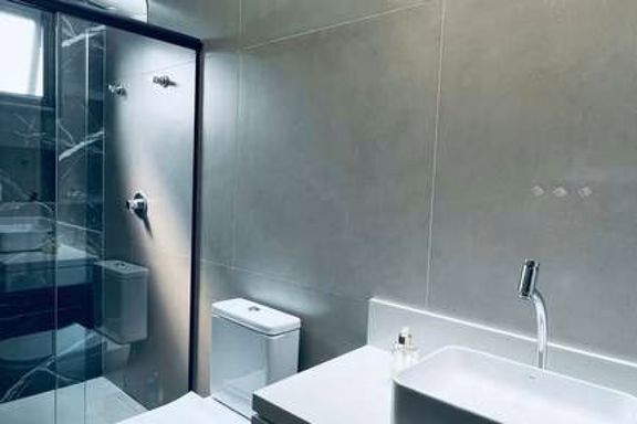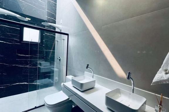 Esta residência contemporânea oferece um design sofisticado e detalhes que fazem a diferença. Com 160 m² de área construída em um terreno de 300 m², a casa possui 3 suítes, sendo que todas contam com portas da marca Pormade, garantindo durabilidade e qualidade. São 4 banheiros ao todo, todos equipados com louças Domus, incluindo o lavabo e a cozinha.