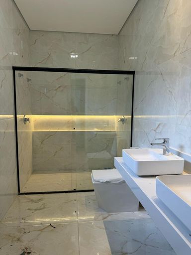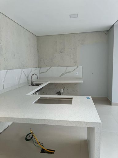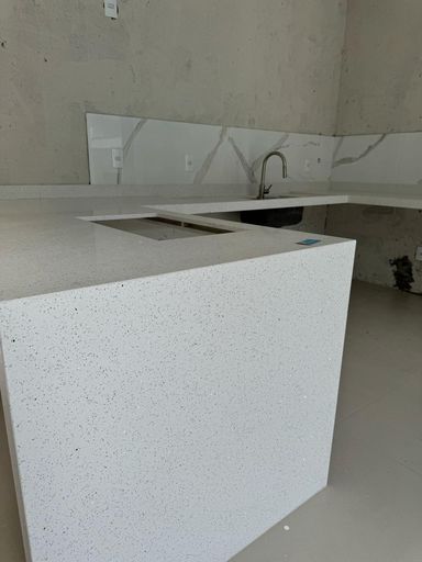 Pedras Branca Estelar na cozinha e lavabo, conferindo um toque de elegância