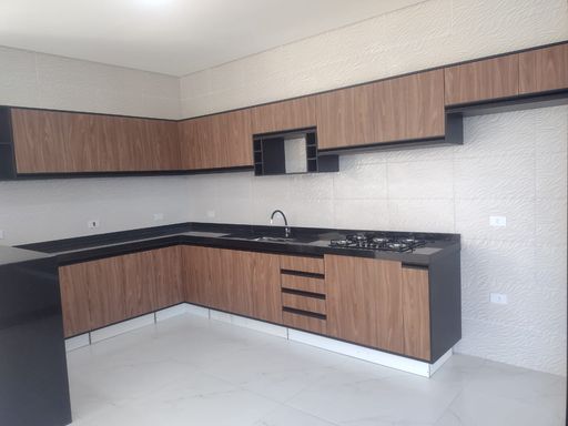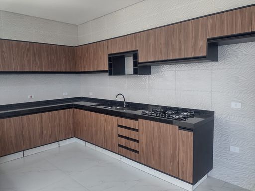 Cozinha espaçosa com móveis planejados e fogão cooktop