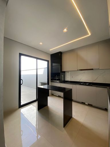 Cozinha moderna conjugada com armários planejados, fogão cooktop e coifa