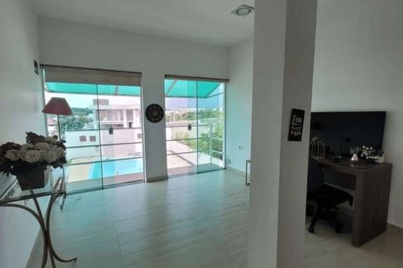 No piso superior, uma sala de TV e 3 dormitórios com sacada, incluindo uma suíte com closet e hidromassagem, garantem conforto e privacidade. O imóvel também oferece um espaço para academia, ideal para manter o bem-estar sem sair de casa.