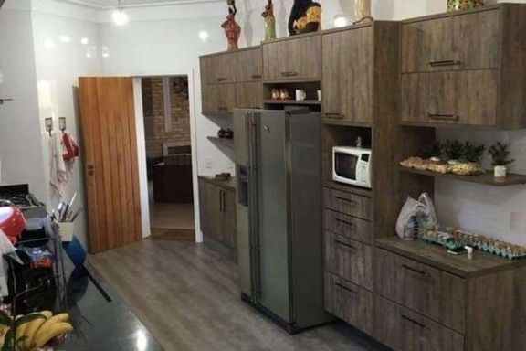 * A garagem coberta acomoda 2 carros, com um pergolado que abriga outros 3 veículos.